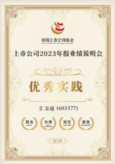 2024年12月3日,中國上市公司協(xié)會發(fā)布“2023年報(bào)業(yè)績說明會最佳及優(yōu)秀實(shí)踐”榜單,經(jīng)上海證券交易所、中證中小投資者服務(wù)中心、證監(jiān)局、中國上市公司協(xié)會綜合評定,匯金通連續(xù)兩年入選“年報(bào)業(yè)績說明會優(yōu)秀實(shí)踐”案例。